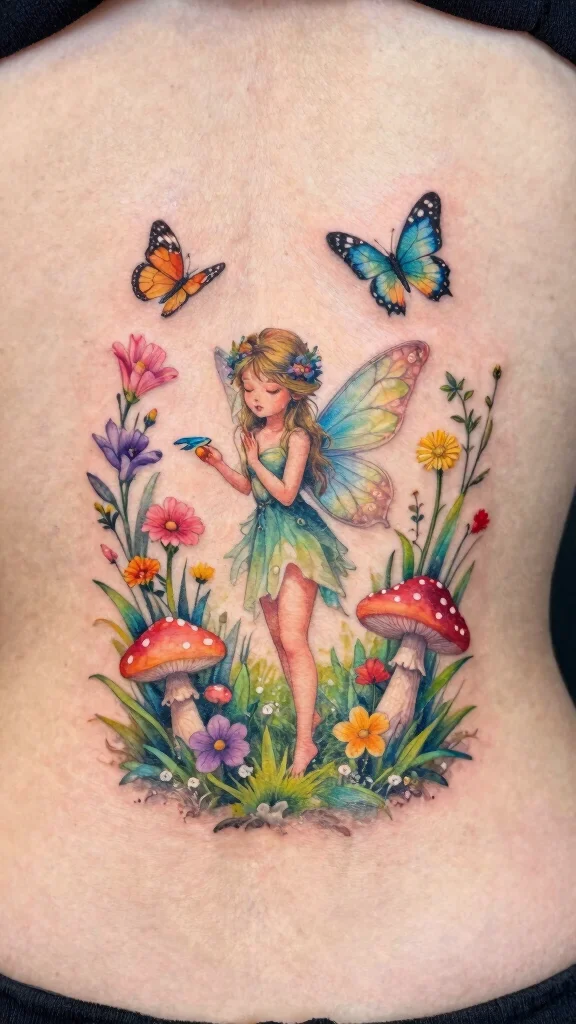 Are you looking for a whimsical cover-up that sparks joy? Consider an ethereal fairy garden tattoo as your next design. This enchanting concept can feature delicate fairies, flowers, and tiny critters, creating a magical scene on your lower back. Picture a fairy in flight surrounded by blooming flowers, all elegantly masking previous designs.