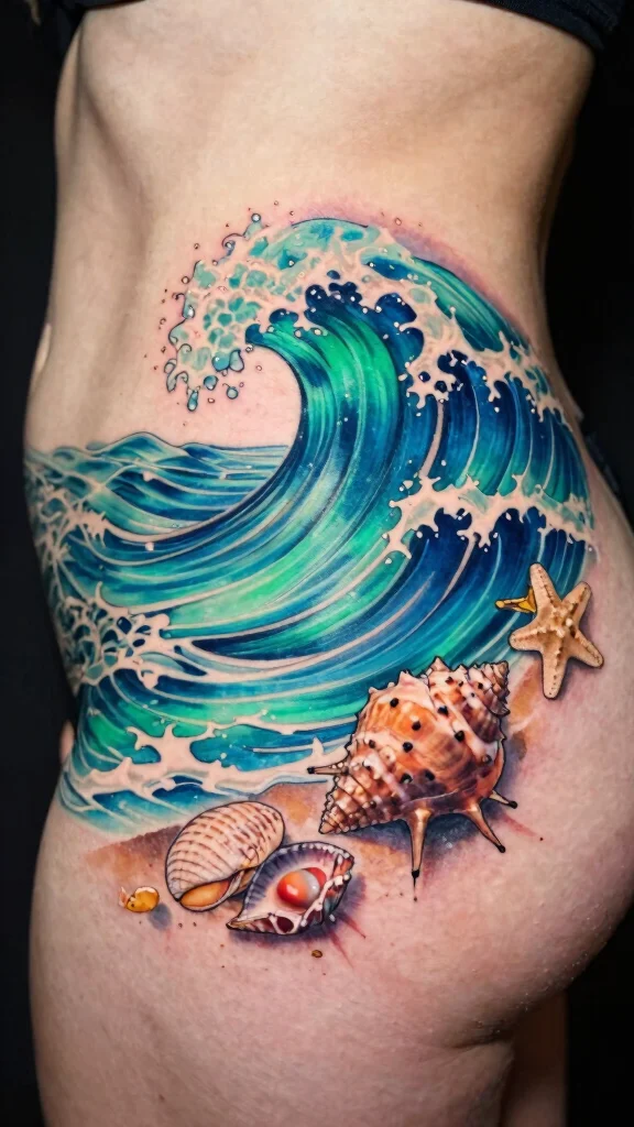 Use shades of blue and green for the waves, complemented by accent colors for the shells to create a vivid palette. Discuss the flow of the waves with your artist to ensure they enhance your body’s curves. You might also consider adding marine elements like fish or seaweed to enrich the design.