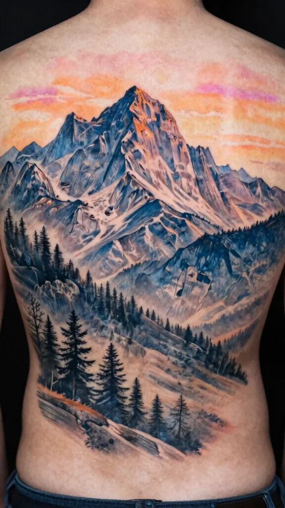 Customize your mountainscape with colors that reflect your personal connection to nature—cool tones for calmness or warm shades for drama. Consider adding elements like a sunrise or sunset to enhance the scene’s beauty. Discuss with your artist how to position details like trees or clouds for a cohesive look.