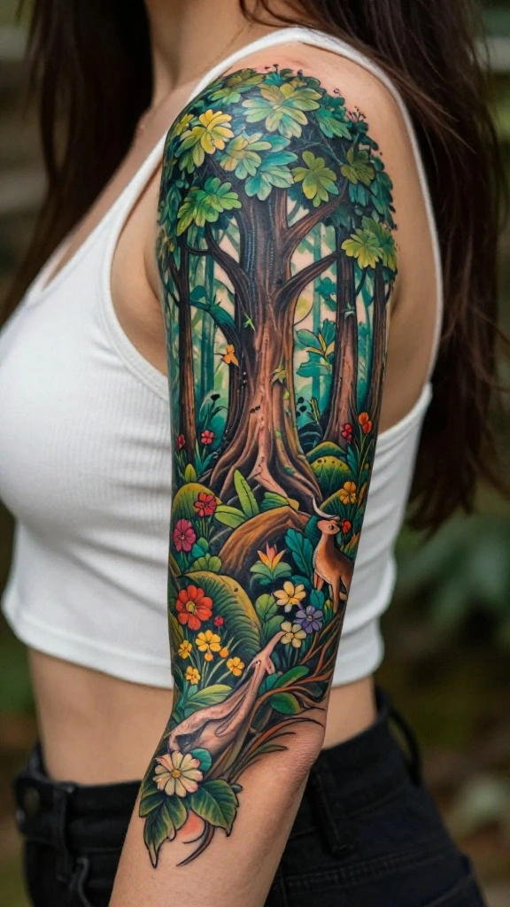Picture an enchanting forest wrapping around your arm, filled with towering trees, lush ferns, and magical creatures. This sleeve tattoo symbolizes growth and the beauty of nature, serving as a constant reminder of your connection to the earth. The design often features various shades of green, accented by vibrant flowers and whimsical animals peeking through the leaves. It’s a perfect choice for anyone who feels at home in nature’s embrace.