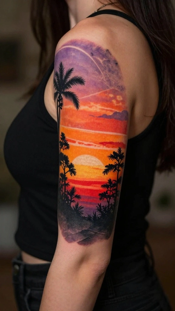 Sunset tattoos capture the day’s end, symbolizing reflection and gratitude. A sleeve tattoo showcasing silhouettes of trees or landscapes against a sunset backdrop evokes peace and serenity.
