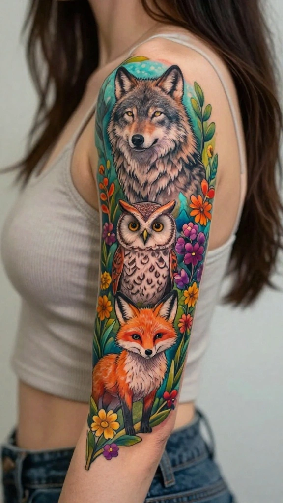 Wildlife tattoos are vibrant expressions of your bond with animals. A sleeve adorned with your favorite animals symbolizes courage, loyalty, and freedom. Consider including creatures like wolves, owls, or foxes, each representing unique traits and lessons.