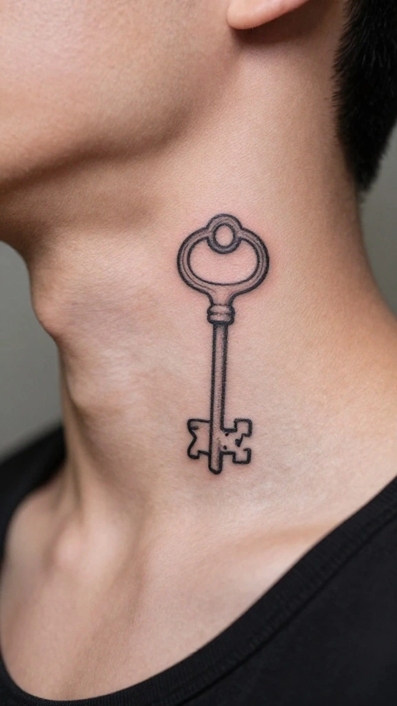 A minimalist key tattoo symbolizes access and personal freedom, making it a captivating choice for neck art. The simple design represents unlocking potential and hidden treasures in life.