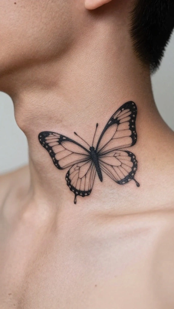 A small butterfly tattoo can be placed anywhere on the neck, often capturing attention while feeling personal. The clean lines emphasize transformation, making it a meaningful choice for personal growth.