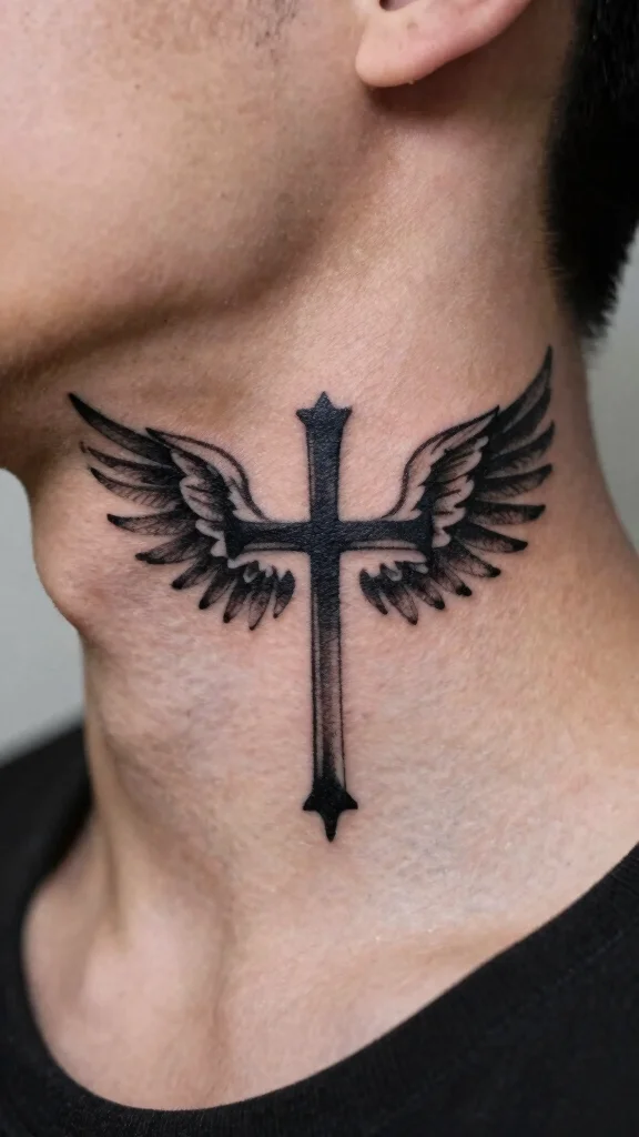 A cross tattoo paired with wings symbolizes freedom and spirituality, representing the soul’s journey. This design features a cross with wings extending gracefully, suggesting elevation and divine connection. The wings can be stylized minimally, focusing attention on the cross while adding depth. This tattoo is perfect for those wishing to convey spirituality while embracing the concept of freedom. A prominent neck placement allows for personal expression and visibility. Key elements to consider: