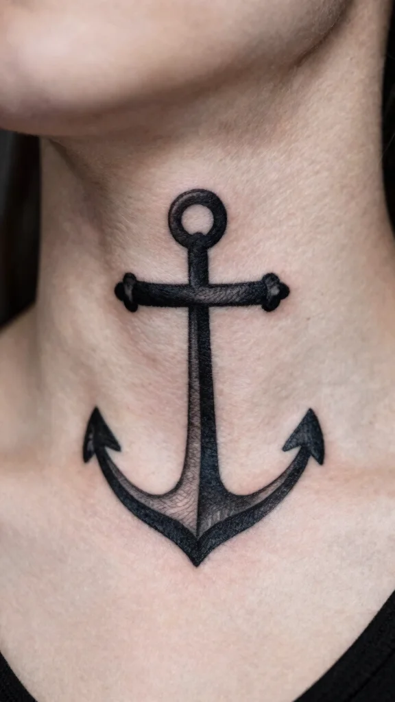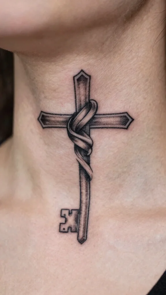 Combining a cross with an anchor symbolizes stability and steadfast faith, making it a meaningful choice for many. This design reflects the concept of being anchored in beliefs while navigating life’s challenges. The anchor can be subtly integrated into the cross for an elegant look. This tattoo suits the neck beautifully, serving as a personal symbol of strength and resilience. Its minimalist style keeps the design clean while conveying a powerful message. Important design elements to consider: