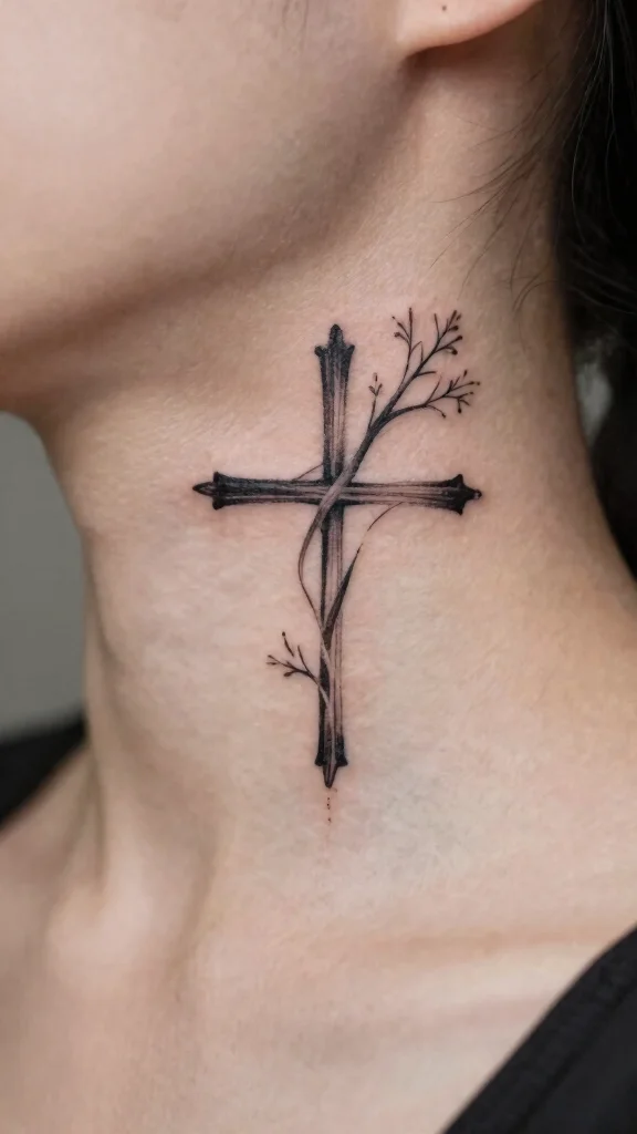 A cross tattoo featuring tree elements symbolizes growth and renewal, making it a beautiful design choice for those who link their faith to nature. The tree can be stylized to fit a minimalist aesthetic while ensuring the cross remains the focal point. This tattoo is perfect for those who appreciate nature’s beauty and want to embody the growth of their spiritual journey. Placing it on the neck creates a stunning visual representation of life intertwined with faith. Key design considerations: