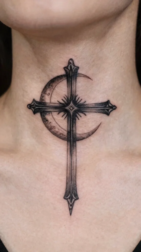 A cross tattoo featuring moon elements symbolizes the connection between faith and life’s cycles, offering a mystical choice for many. The moon can be depicted in various forms—crescent, full, or abstract—incorporated alongside or around the cross. This design conveys tranquility and balance, reflecting life’s ebb and flow. Ideal for those who appreciate celestial aspects of spirituality, this tattoo can be placed delicately on the neck, allowing for personal expression that resonates with the universe. Key design elements to explore: