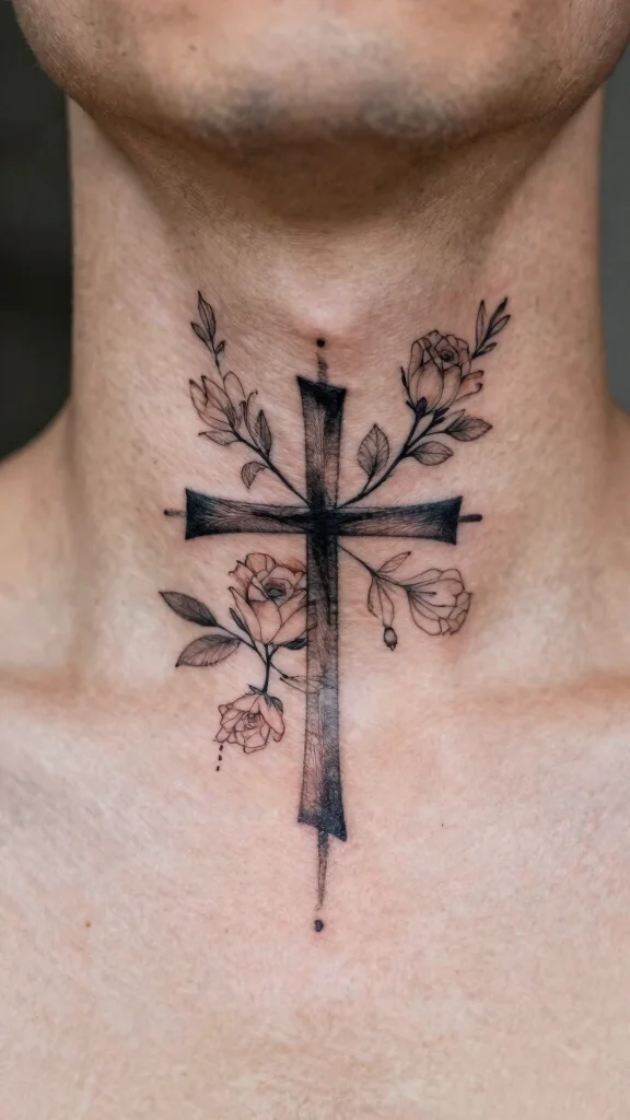 A cross design adorned with floral accents adds a vibrant touch to neck tattoos. Flowers symbolize growth and beauty, enhancing the traditional meaning of the cross. This design often features a minimalist cross complemented by elegant floral patterns, creating a stunning visual contrast. You can stylize the flowers to fit your aesthetic—think thin outlines or soft shading for a more subtle approach. Choose flowers that hold personal significance, like roses or lilies, to make the tattoo even more meaningful. Consider these design elements: