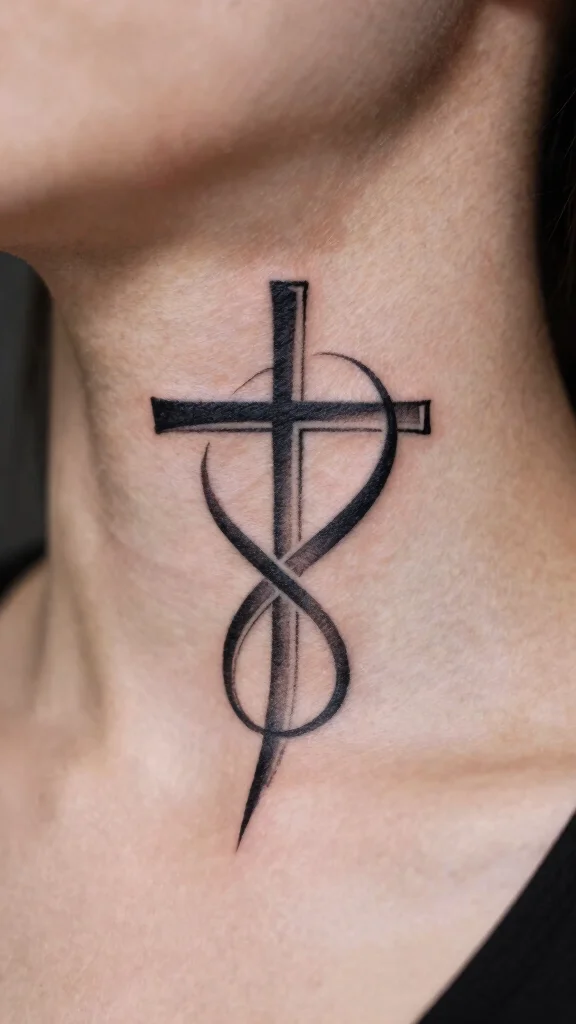 Integrating a cross with an infinity symbol creates a powerful design that reflects faith and everlasting love. This tattoo illustrates how spiritual beliefs can transcend time, making it a deeply meaningful piece. The infinity symbol can be creatively linked with the arms of the cross, making for a unique representation of your beliefs. This design works exceptionally well on the neck, where it can catch the eye while conveying a powerful message of strength and continuity. Keeping the design minimalist allows the intricate details to shine without overwhelming the viewer. Key elements to consider: