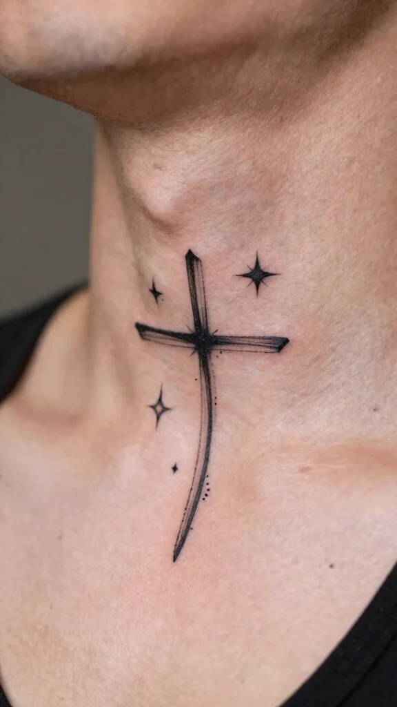 Adding star elements to a cross tattoo brings a celestial feel that reflects aspirations and guidance. This design often showcases a cross adorned with small stars, symbolizing hope and divine inspiration. The stars enhance the traditional meaning of the cross, making this tattoo both visually appealing and meaningful. A minimalist approach works best here, keeping the stars subtle yet impactful. This tattoo can be positioned on the neck to catch the light or easily concealed when needed. Key design features to explore:
