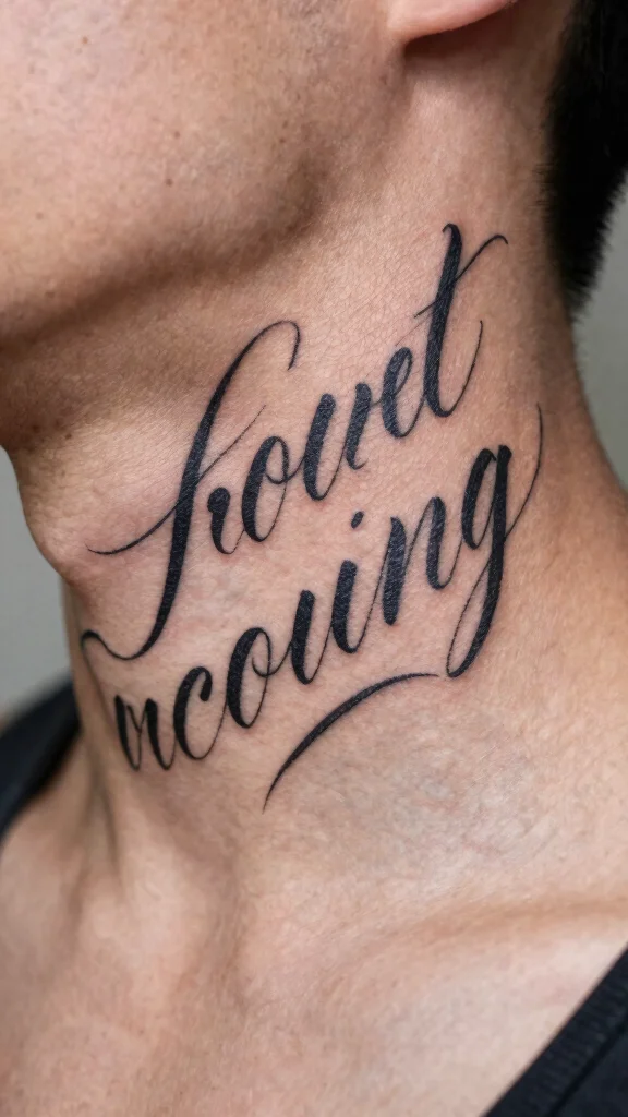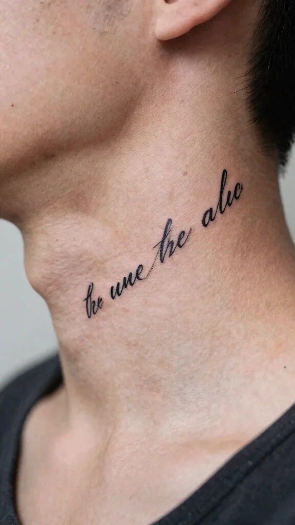 Script tattoos can be a powerful way to express your personal beliefs or favorite quotes. With a range of styles from bold cursive to minimalist print, these designs are perfect for neck and throat placements. A carefully chosen word or phrase can serve as a daily inspiration, reflecting your values and aspirations.