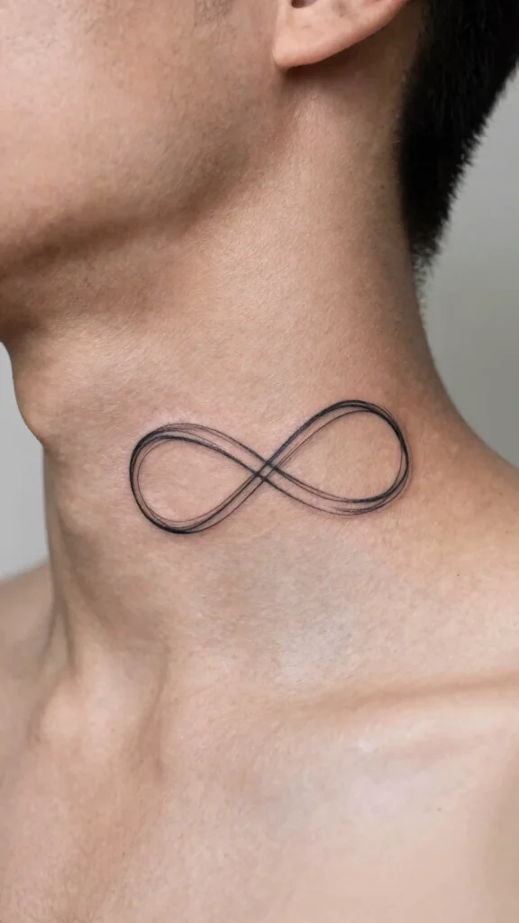 Infinity symbols represent eternal love and limitless potential, making them popular for neck tattoos. Minimalist infinity designs can elegantly wrap around the neck, symbolizing connections that transcend time. Many men incorporate initials or small motifs, adding personal significance to the design.