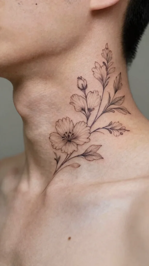 Floral tattoos maintain popularity, but fine line designs offer a modern, delicate take on this classic theme. These tattoos feature intricate outlines that capture the beauty of flowers with minimalistic details. Roses, lilies, or abstract floral patterns can symbolize love and growth, making them elegant choices for neck placements.
