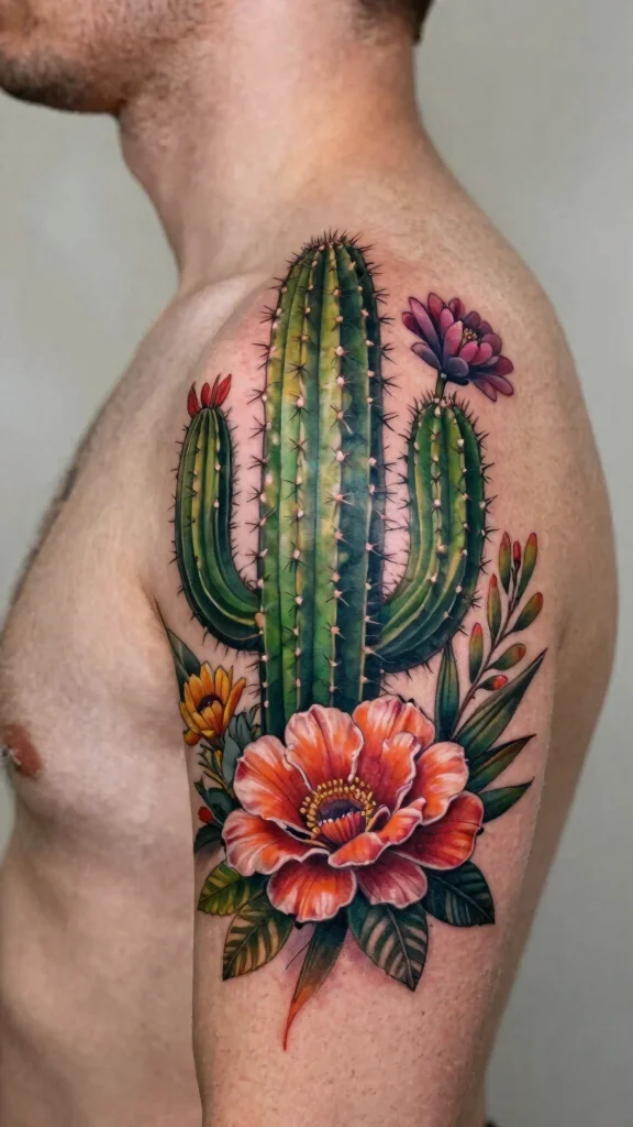 – Use bright colors for the flowers to enhance the contrast with the cactus.This design not only offers a cover-up but transforms your skin into a canvas of personal stories.