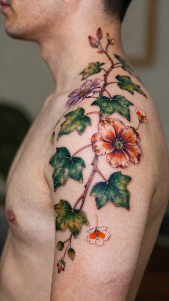 An ivy and floral composition creates a beautiful intertwining design that embodies a natural feel. Ivy symbolizes fidelity and eternal life, making it a meaningful choice for a cover-up tattoo. This design can be built around existing tattoos, weaving ivy through flowers for a flowing, cohesive look that effectively camouflages older work.The contrasting shapes of ivy leaves and blooming flowers create striking visuals while allowing for various moods, from earthy to romantic. This flexibility makes it suitable for anyone.Ideas:– Use dark greens for ivy and vibrant colors for flowers for a lively effect.