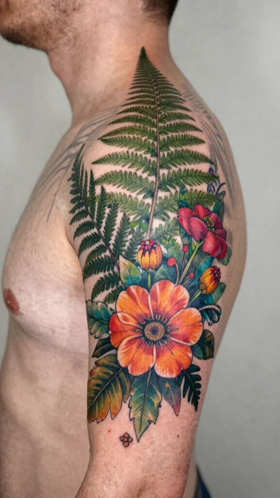 Ferns bring tranquility and a connection to nature, making them excellent companions for floral tattoos in cover-up designs. Layers of ferns and flowers can effectively mask previous tattoos while introducing a serene aesthetic to your body art. With various shades of green for ferns and colorful flowers, this design can create a vibrant yet calming composition.The delicate fronds of ferns weave beautifully with bold flowers, resulting in an intricate and expressive tattoo. This style resonates with those who appreciate nature and its beauty.Suggestions:– Vary the sizes of ferns and flowers for added depth.