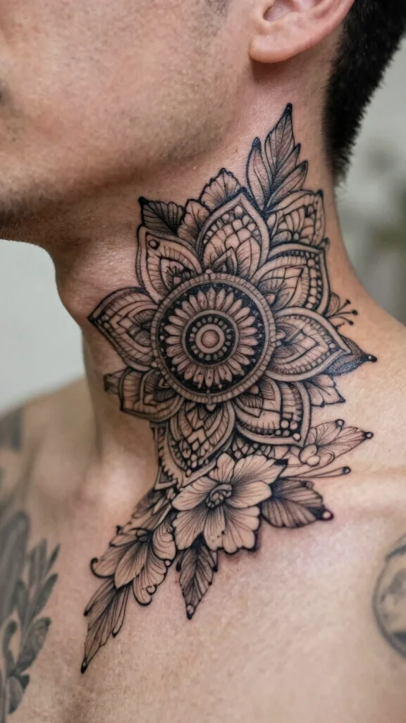 Mandala tattoos are rich in symbolism and artistry, making them a captivating choice for a neck cover-up. Blending floral patterns with mandala designs creates a unique and deeply personal piece of body art. The intricate nature of mandalas allows for seamless integration of flowers, resulting in a harmonious blend of spirituality and beauty.This design effectively conceals old tattoos while delivering a visually stunning work that resonates with your personal beliefs. The balance between floral and geometric elements can be tailored to your preferences.Key Points:– Incorporate personally significant elements, such as specific flowers or symbols.