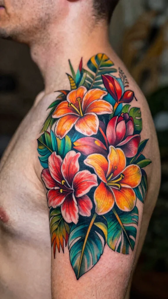 Tropical flowers, with their vibrant colors and distinctive shapes, make for stunning neck tattoos. An ensemble of tropical flowers serves as a vibrant cover-up that reflects a love for nature and adventure. This design can include species like birds of paradise and plumeria, creating a lively palette that can easily overshadow older tattoos.Their bold colors bring warmth and energy to your body art, making it a striking choice. Proper arrangement can enhance the overall effect, creating a cohesive look.Suggestions:– Mix different tropical flowers for a dynamic design.