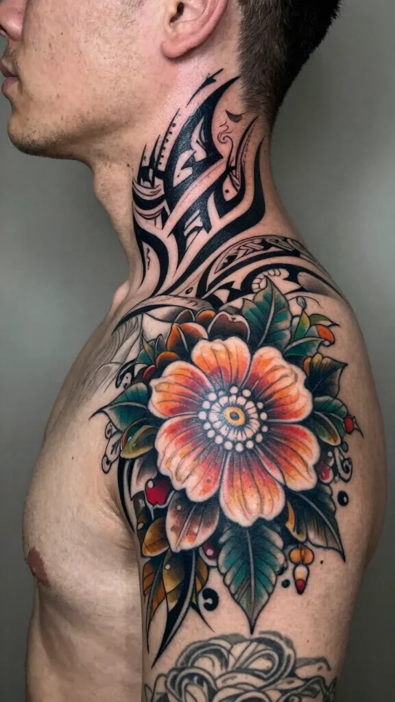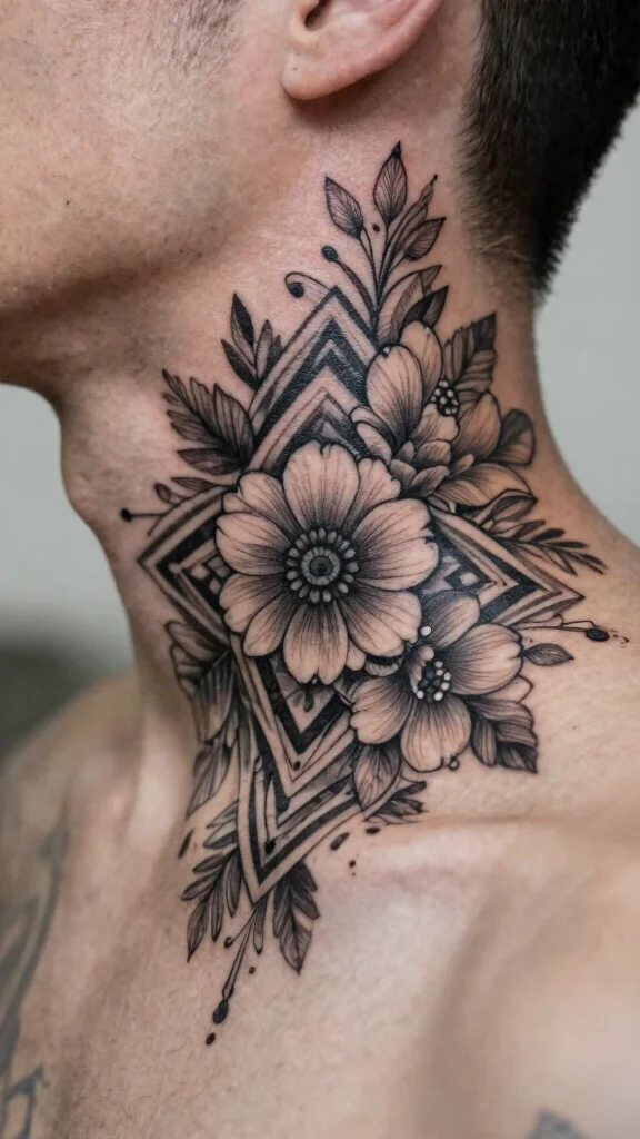 Combining tribal art with floral designs creates a bold and beautiful aesthetic for a neck tattoo. Tribal floral tattoos effectively cover existing ink while making a strong statement. The contrast between dark tribal patterns and soft floral features creates a unique visual appeal, perfect for those who want to express both masculinity and tenderness.These designs can incorporate sharp angles and soft curves, allowing for a dynamic look. Selecting elements that have personal significance can enhance the meaning behind your tattoo.Recommendations:– Choose colors that make the floral elements pop against the tribal black ink.