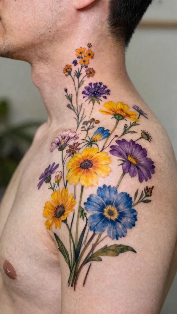 Wildflowers exude a free-spirited vibe, making them ideal for a playful neck tattoo cover-up. A wildflower collection can effectively mask older tattoos while showcasing your individuality and creativity. This vibrant design can feature a mix of colors and shapes that bring a refreshing touch to your body art.Each flower type can represent different aspects of nature, creating a lively and organic feel. This style is perfect for those wanting to express freedom and exploration through their tattoos.Ideas:– Combine various wildflowers for a unique bouquet effect.