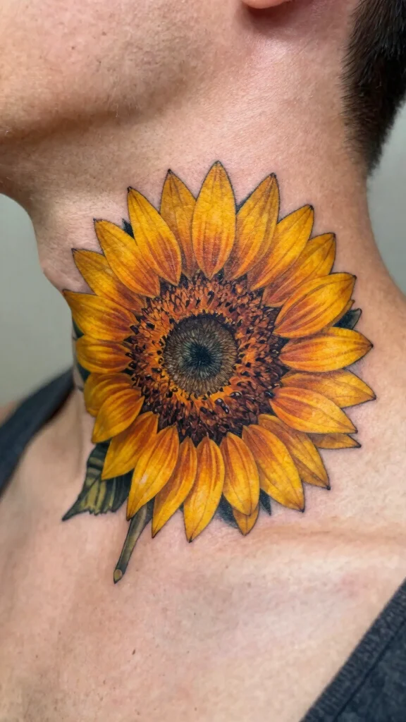Sunflowers radiate warmth, cheerfulness, and positivity, making them an excellent choice for a neck cover-up tattoo. Their bold designs can effectively mask previous ink while adding a vibrant touch to your body art. A large sunflower can dominate the neck area, creating a striking contrast against your skin.Bright yellow petals draw attention, while the intricate center adds depth and detail. When positioned well, sunflowers can beautifully frame your face, enhancing your features.Consider:– Pair sunflowers with green leaves for a fuller effect.