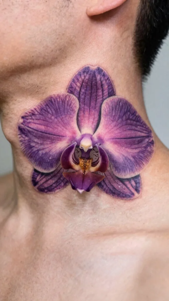 Orchids symbolize beauty, strength, and luxury, making them a sophisticated choice for a neck cover-up tattoo. Their unique shapes and vibrant colors can effectively mask old tattoos while introducing elegance to your body art. Orchids can be designed in various shades, allowing for a personal touch while still standing out.Strategically placing orchids along your neck can elongate its appearance and create a streamlined look. This versatility makes them an excellent option for any style preference.Tips:– Consider using multiple types of orchids for a more complex design.