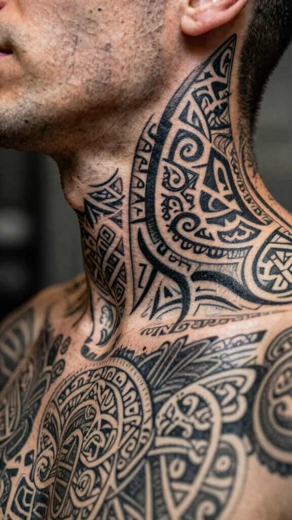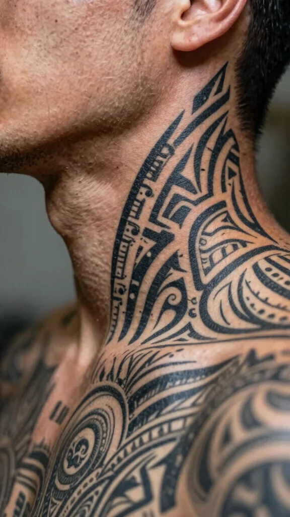 Tribal tattoos carry cultural significance and can connect you to your heritage. These designs often feature bold lines and intricate patterns that wrap around your neck. A tribal band or series of patterns can symbolize strength and your life journey.