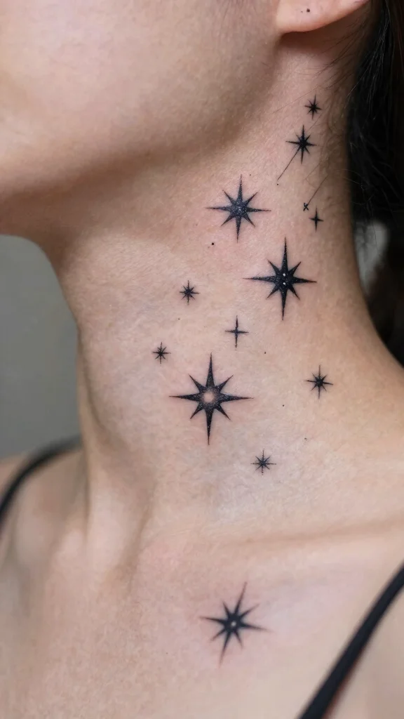 Star tattoos represent dreams and aspirations beautifully. A cluster of stars or a single star on your neck can serve as a personal reminder of your goals. This style can be playful with whimsical designs or sleek and minimalist.