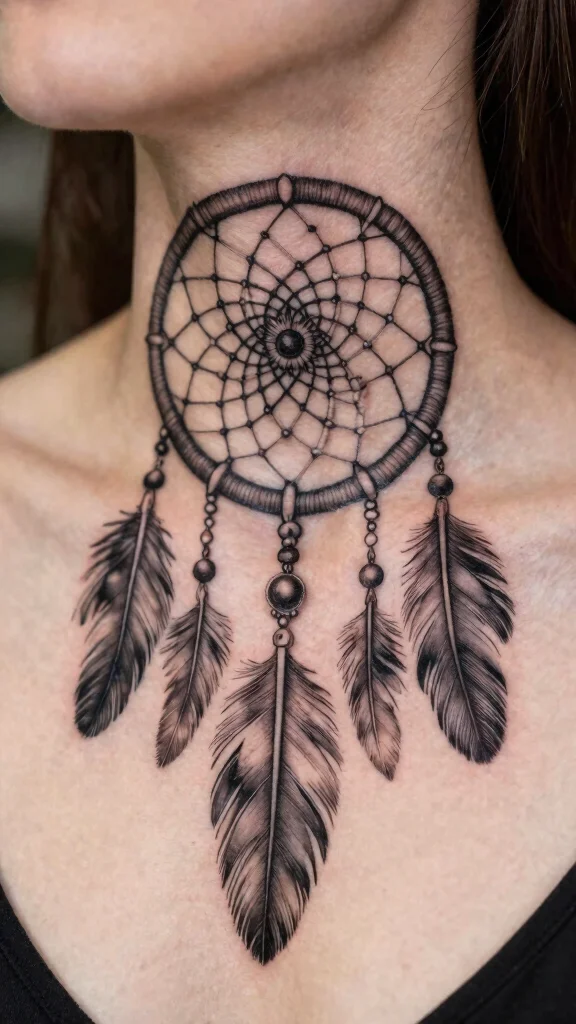 Dreamcatcher tattoos symbolize protection and hope, adding a beautiful narrative to your neck. These intricate designs can be small and delicate or larger and more detailed, wrapping around your neck for striking visuals.