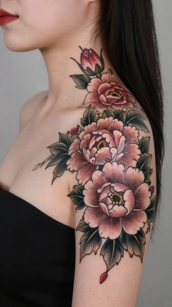 You can choose vibrant colors or soft pastels to create warmth and vibrancy in your tattoo. Their generous blooms can make a statement or subtly enhance your beauty.