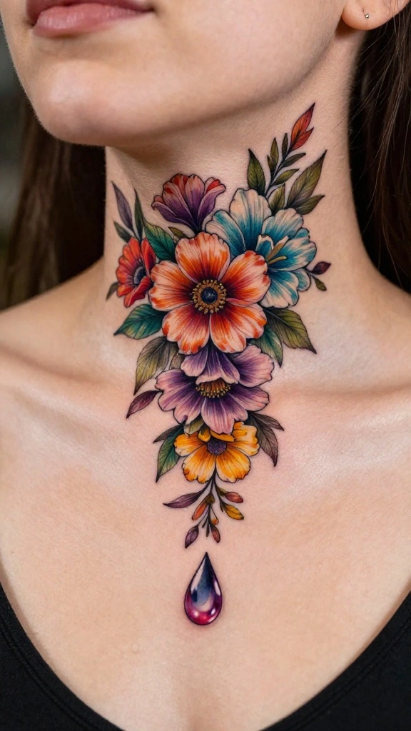 A floral teardrop tattoo creates a unique shape that gently frames the neck. This design often features flowers cascading in a teardrop formation, giving it a graceful and flowing appearance. The teardrop symbolizes beauty and emotion, making it a profound choice for expressing deeper feelings through your art.