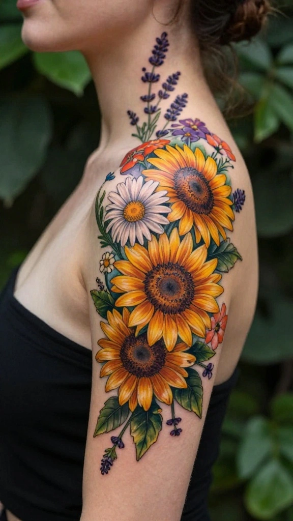 These tattoos can be customized with different flower types, offering you a unique aesthetic. Whether you prefer soft pastels or vibrant colors, wildflowers can create a joyful and expressive tattoo that resonates with your adventurous spirit.