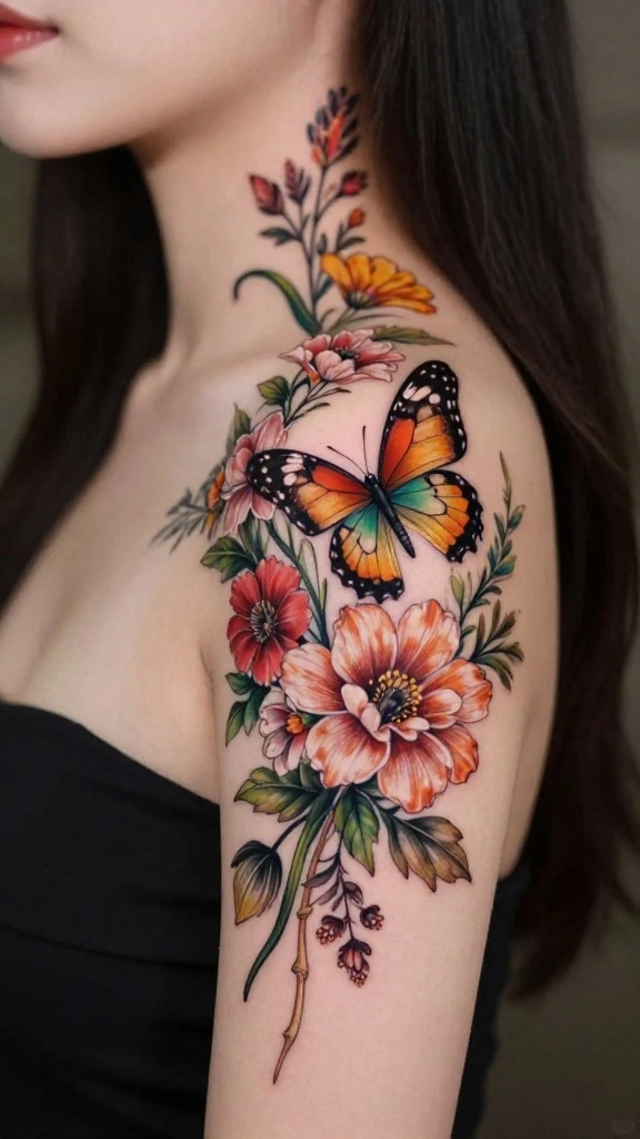 A whimsical butterfly combined with floral elements creates an enchanting tattoo design. This pairing symbolizes transformation and beauty, making it a meaningful choice for many women. You can draw butterflies in vibrant colors surrounded by flowers, creating a lively and colorful tattoo.