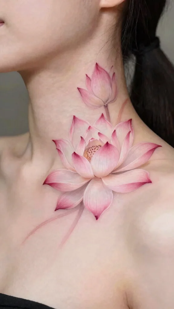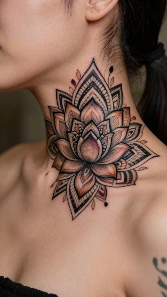 The lotus flower is a powerful symbol of purity, enlightenment, and rebirth, making it a popular choice for neck tattoos. This design can vary from a single striking lotus to multiple smaller blooms intertwined with intricate patterns. The unique shape of the lotus enhances visual impact, allowing for personal expression.