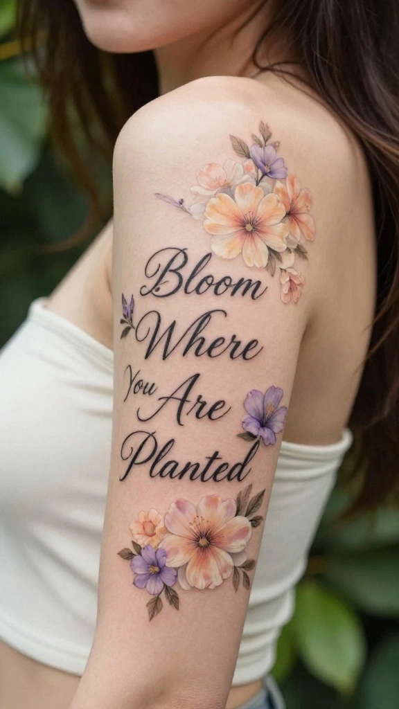 If you’re looking for a tattoo that embodies strength and growth, this quote fits perfectly. Imagine delicate flowers intertwined with the script, showcasing resilience in any situation. Soft hues like peach and lavender can bring this design to life, highlighting the beauty of flourishing where you are.