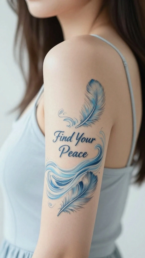 A soothing quote that promotes mindfulness and tranquility. Picture a design featuring flowing elements like feathers or waves around the text to evoke a sense of calm. This tattoo represents the journey to inner peace and self-acceptance.