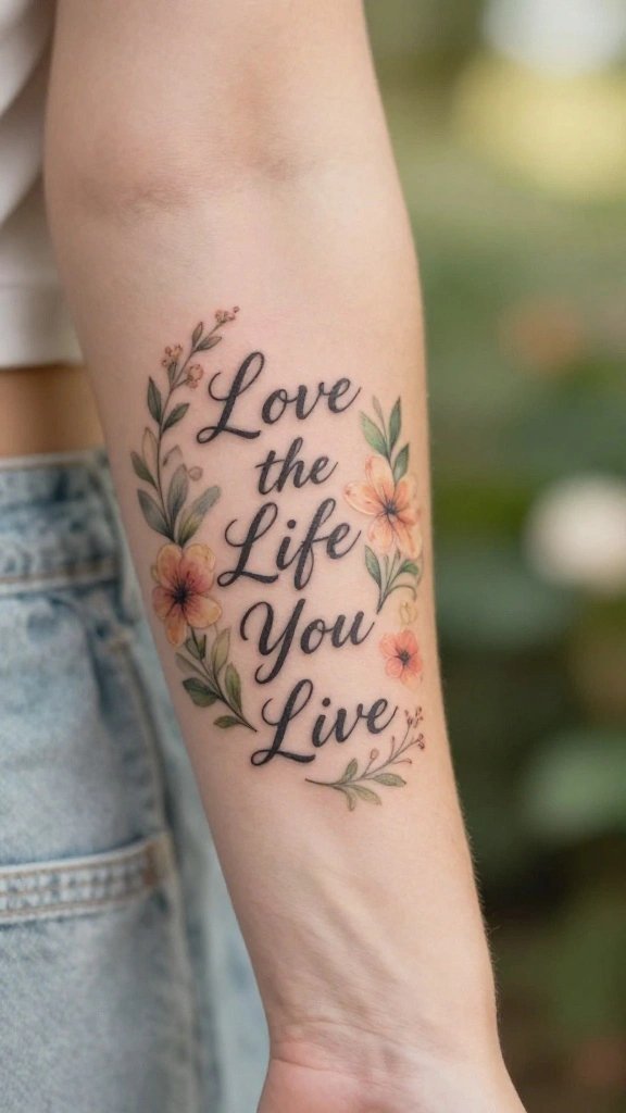 This quote encourages you to appreciate your journey wholeheartedly. Picture a soft, flowing script paired with gentle floral designs, creating an inviting and warm look. This tattoo serves as a reminder to embrace all aspects of life with love and gratitude.