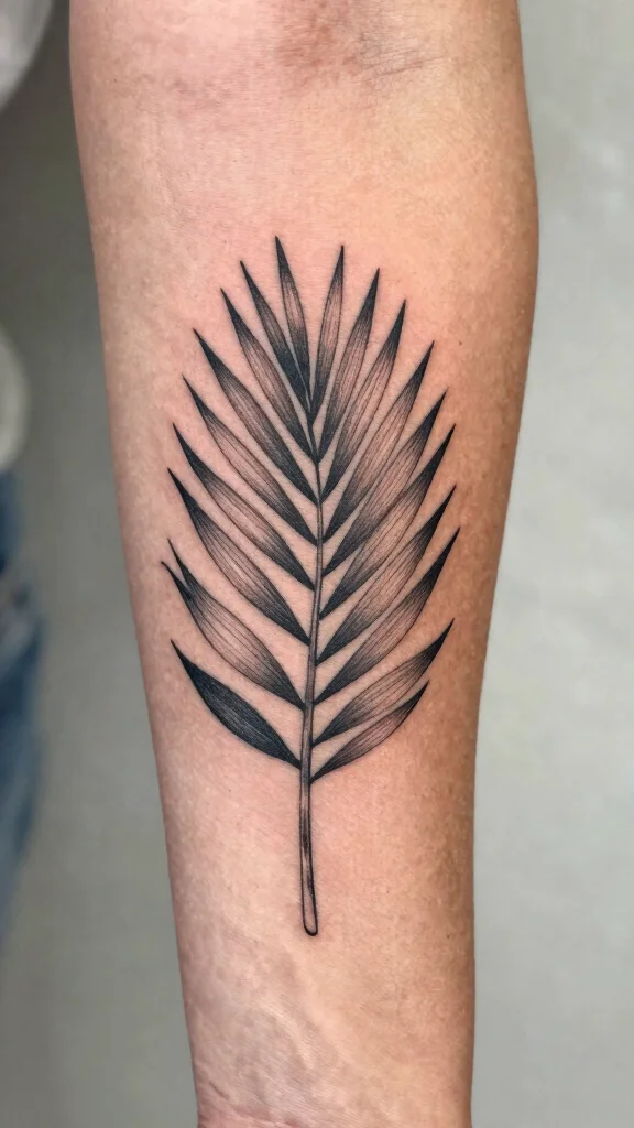 A minimalist palm leaf tattoo embodies a spirit of adventure while adding a refreshing aesthetic to your leg.