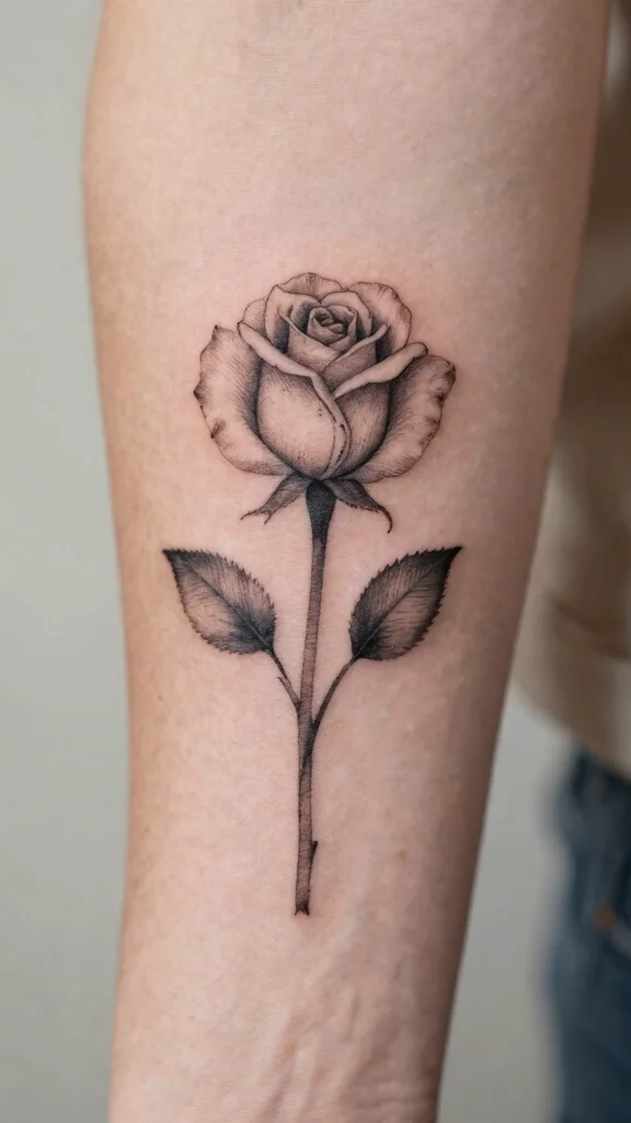 The minimalist rosebud tattoo is a lovely way to express your appreciation for beauty in simplicity. With just a few strokes, this small design captures the essence of a blooming rose, making it perfect for anyone who loves feminine elegance. Roses are timeless symbols of love, adding a personal touch to your body art.
