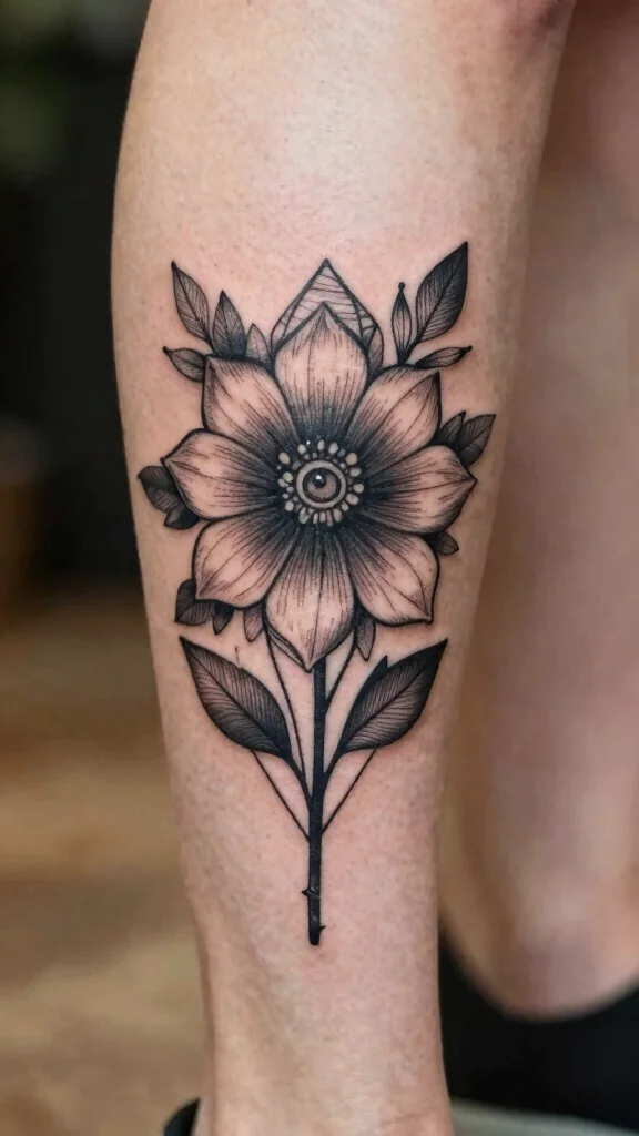 A geometric flower tattoo reflects a balance between nature and modernity, making it a stylish choice for your leg.