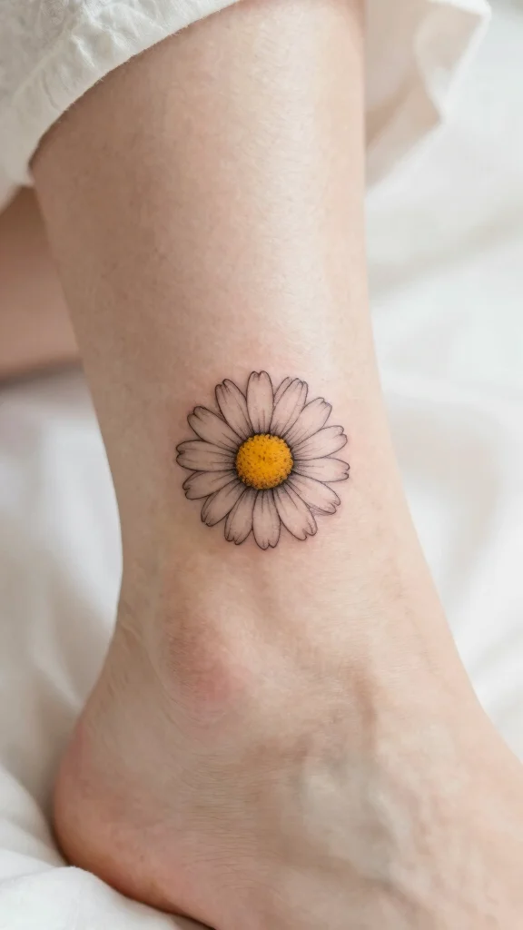 Do you want a tattoo that radiates cheerfulness? The simple daisy tattoo embodies innocence and joy, perfect for those seeking a light-hearted design. Often illustrated with classic white petals and a sunny yellow center, this tattoo offers a fresh vibe, looking stunning on the ankle or side of the leg.