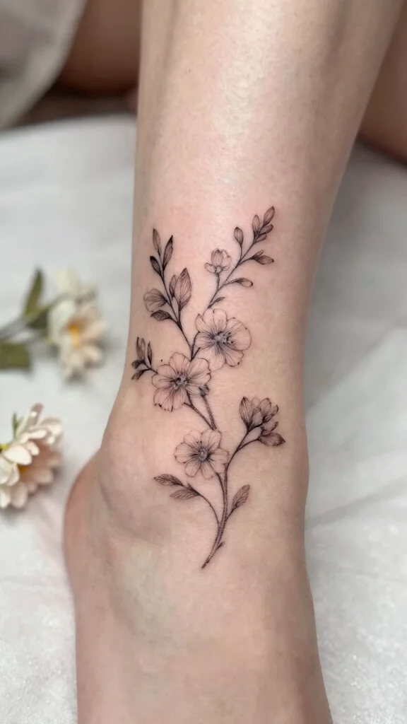 Are you searching for an intricate yet understated tattoo? The tiny floral vine is an excellent option for those who appreciate elegant designs. This tattoo can gracefully wrap around the ankle or flow along the side of the leg, featuring delicate blooms and leaves that symbolize growth and life’s journey.