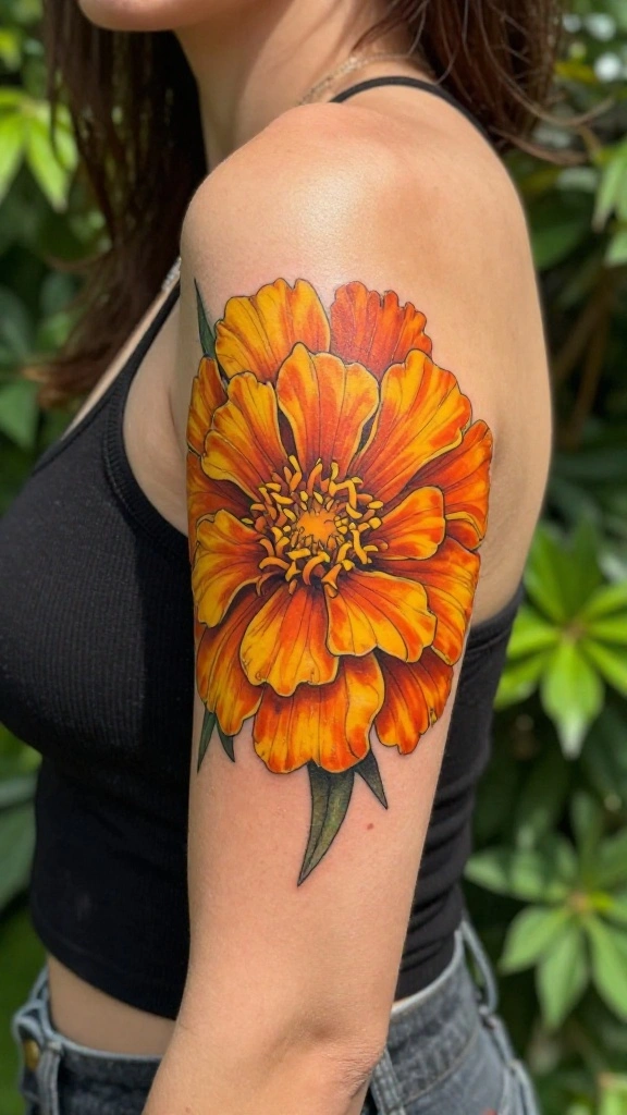 You can design a marigold tattoo with simple outlines or intricate details, depending on your style preference. A large marigold on the upper arm can make a stunning statement piece.