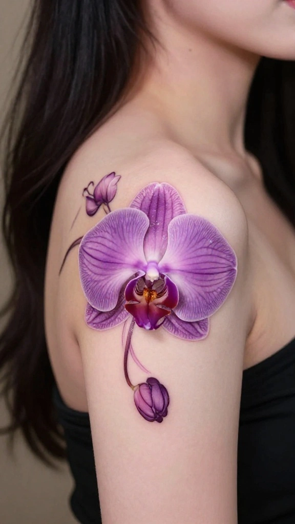 You can design an orchid in a minimalist style or with intricate petal work for a more detailed look. A single bloom on your shoulder or arm can be striking and elegant.