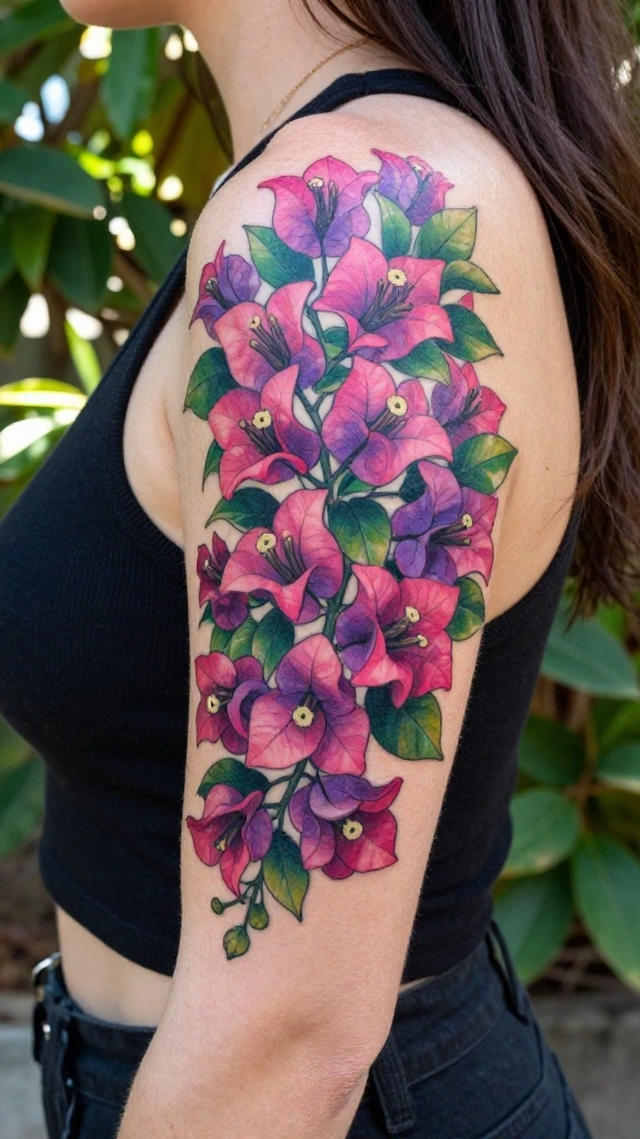 Bougainvillea represents the beauty of travel and adventure, making it a vibrant tattoo choice for free spirits. Its colorful blooms can reflect your love for exploration and zest for life. You can design bougainvillea tattoos in bold colors, creating eye-catching pieces that stand out.
