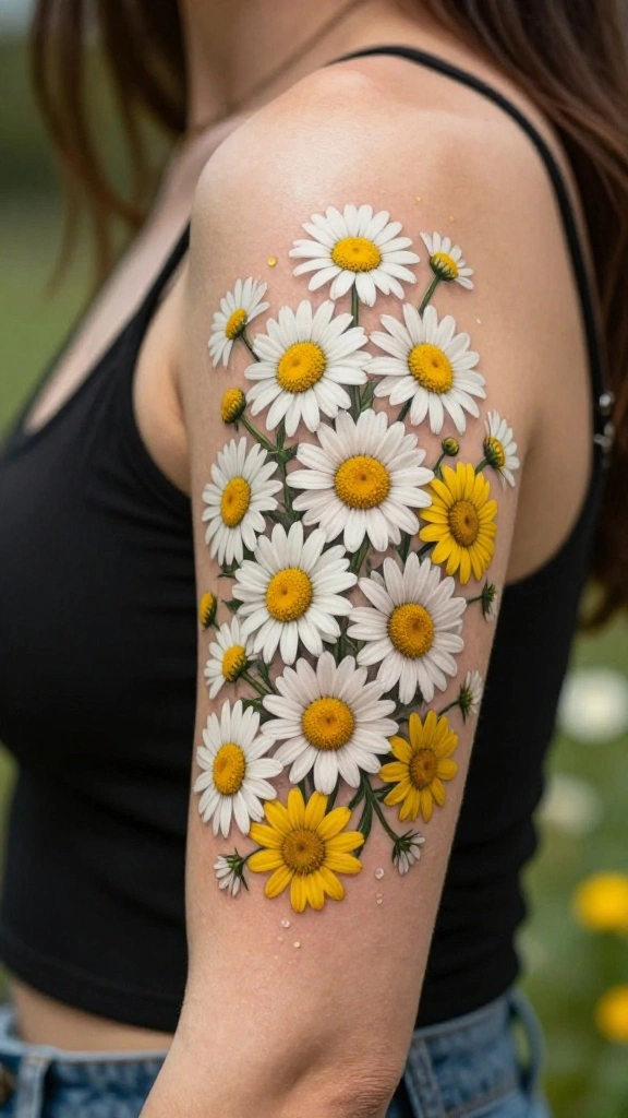 Incorporating daisies into your tattoo can reflect a carefree spirit and serve as a nostalgic reminder of simpler times. You might even consider clustering them for a more dynamic effect on your arm.