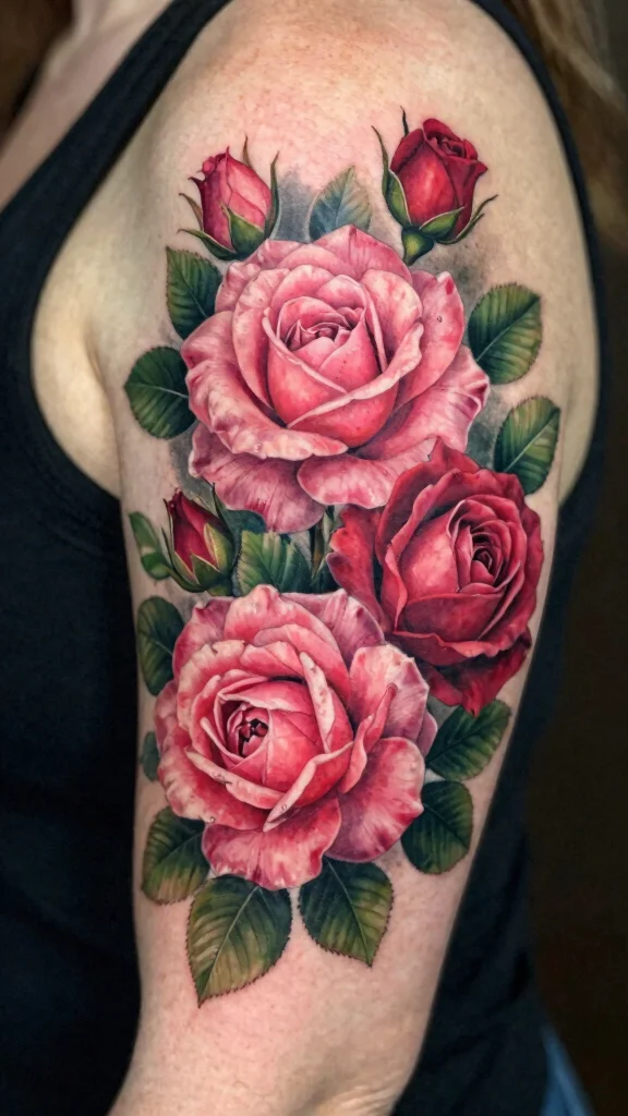 Consider personalizing your tattoo by selecting roses that symbolize significant moments in your life. You can enhance the design with delicate leaves and twisting vines, adding a sense of movement and growth to your piece.