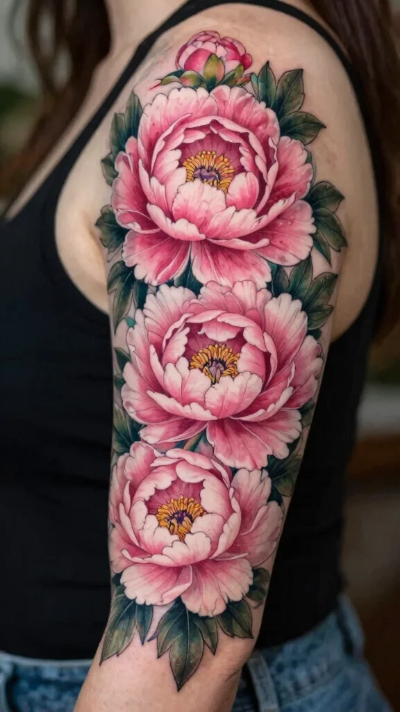 This design pairs beautifully with softer flowers or greenery, creating a romantic garden effect. The full blooms of peonies make them ideal for larger tattoos, especially on a sleeve.