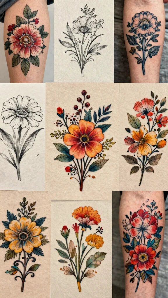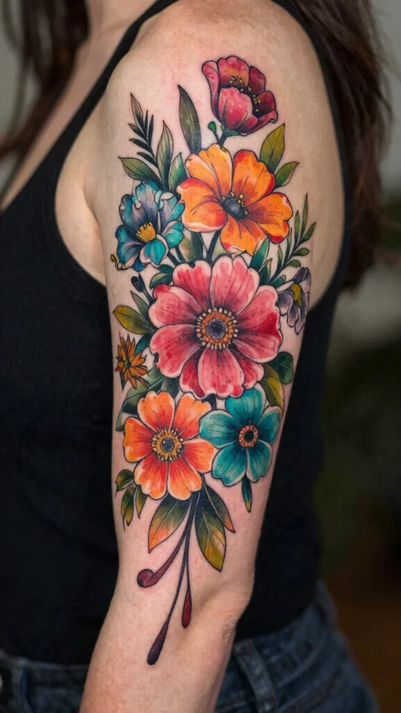 Each flower can hold a unique meaning, and combining them creates a vibrant narrative. This tattoo style offers immense creative freedom, making it ideal for artistic souls.